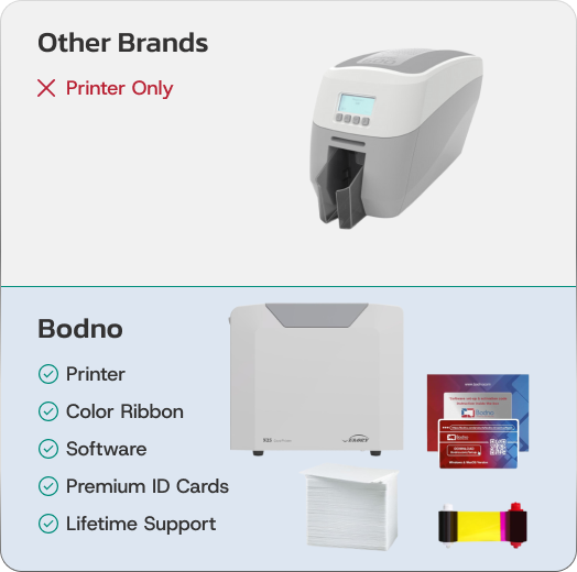You get everything in one box: the printer, Bodno software, blank PVC cards, a color ribbon, and expert support. It’s plug-and-print—no extra purchases required.